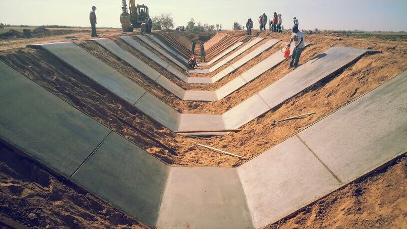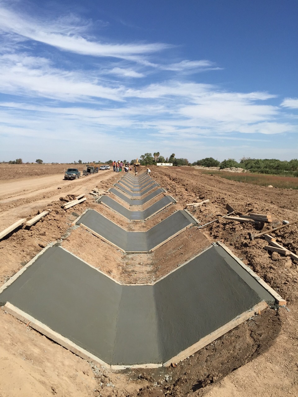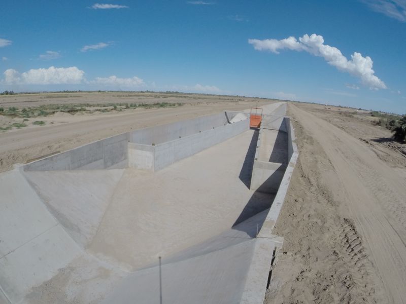 In the Mexicali valley, more than 32 kilometers of concrete-lined canals are built at different stages through compacted earthen levees and simple concrete lining.